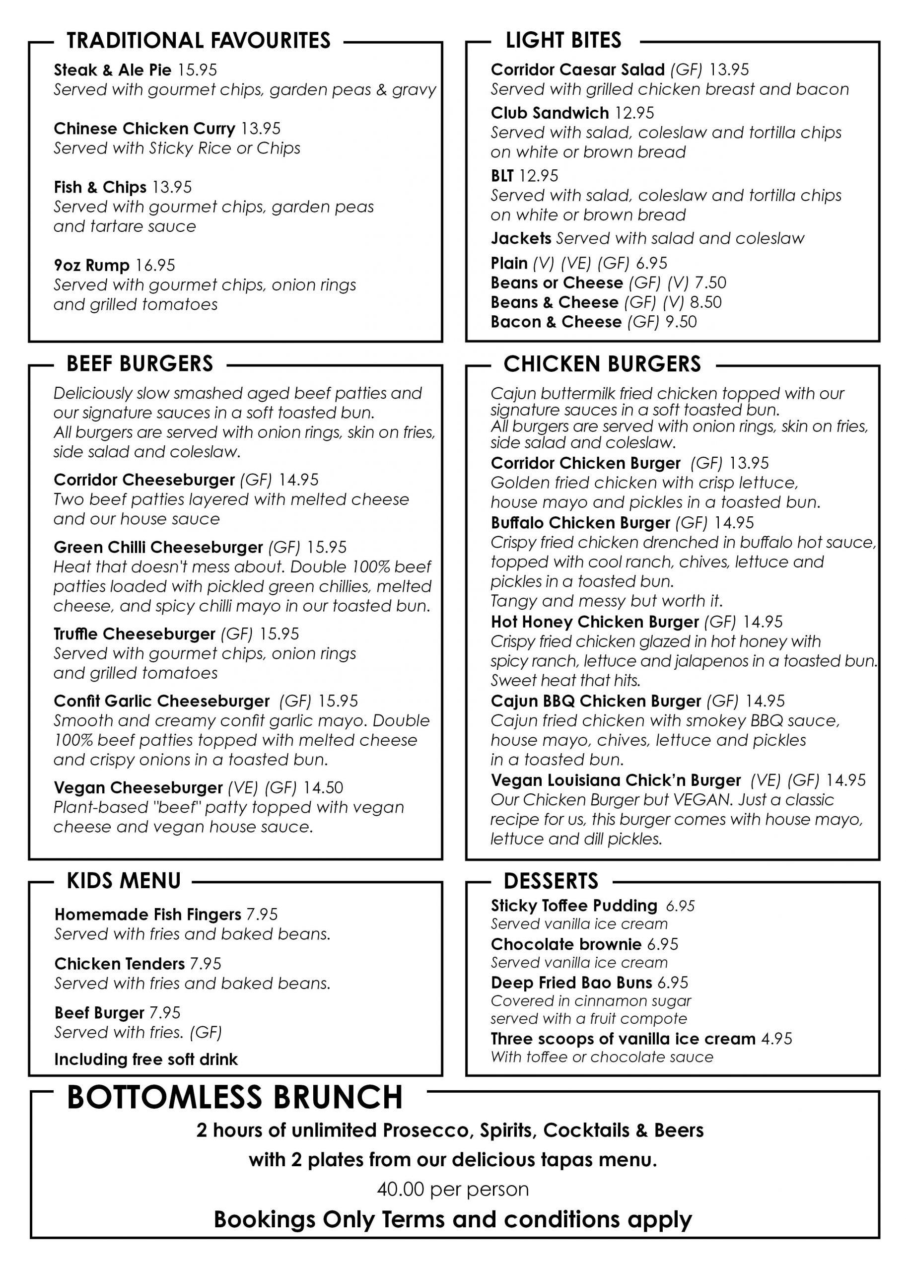 Drinks include Wine, Prosecco, Spirits, Beers and Cocktails